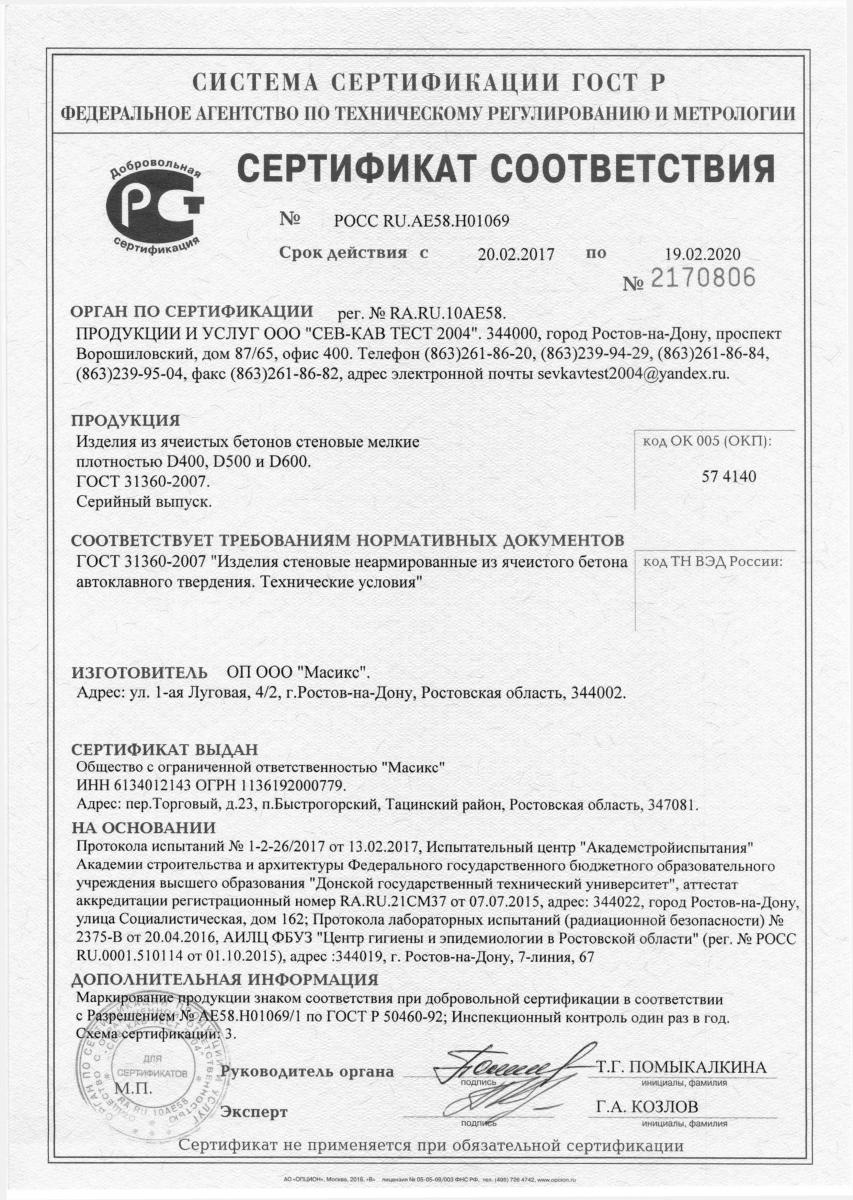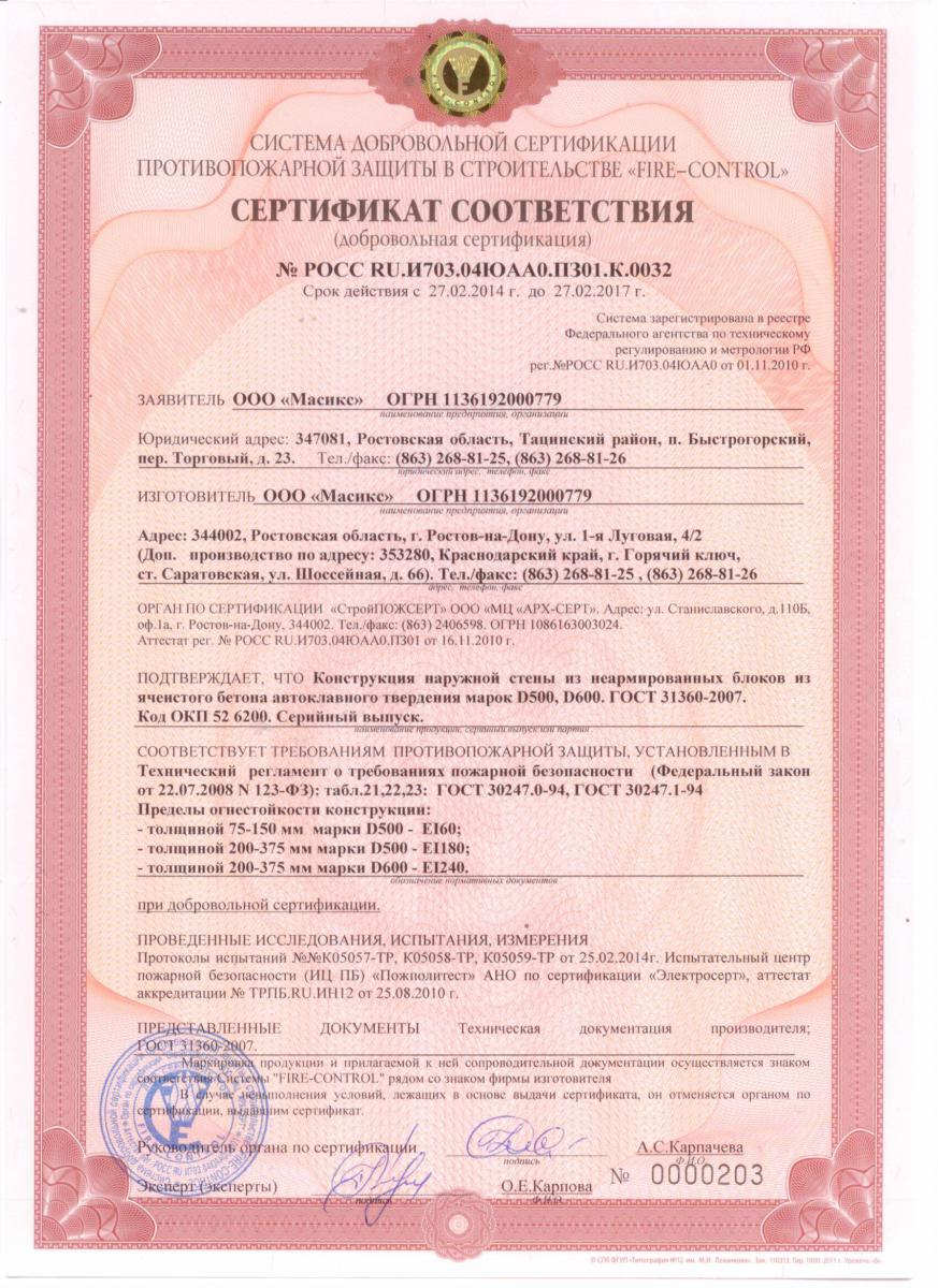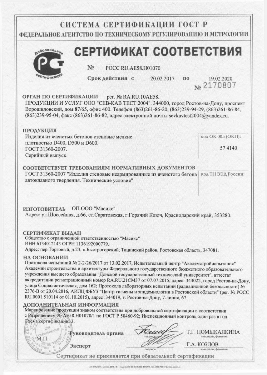 Газобетон Masix D500 обладает следующими характеристиками: